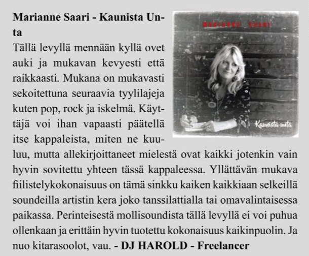 Marianne Saaren kaksi uutta julkaistua singleä ”Uskon aurinkoon” ja "Kun rakkaus ei